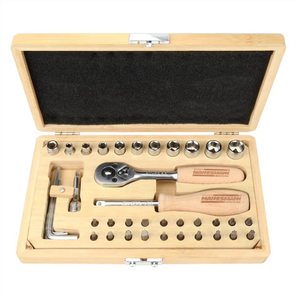 This 41-piece socket set in bamboo cassette from Brüder Mannesmann will help you loosen even the most stubborn nuts and bolts effortlessly. The fine-toothed ratcheting wrench ensures that the sockets are locked securely in place, and allows for the quick exchange of sockets. Taking into account all safety-relevant and ergonomic aspects, the handles of the tools are made of natural beech wood. Made of excellent chrome-vanadium steel, these socket drivers are rust resistant. Also, they lie optimally in the hand and are resilient and durable. With cutouts in the supplied case, every tool has its place. They are ideal for work on cars, motorcycles, bicycles and all assembly work in the home or workshop. With this socket set, Brüder Mannesmann offers you an optimal tool composition in a sustainable, neatly finished bamboo cassette.