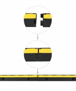 This set of 2 single-channel cable protector ramps has been specifically designed for concealing and protecting wires, cables, hoses, tubes or pipes. The ramps are made of rubber, which is lightweight, hardwearing and durable. The ramps are coloured in bright yellow and have warning symbols on the surface to make them more visible. Each ramp has a single channel track to guide and protect your cables and can support a maximum weight of 25 tonnes. The cables can be easily placed or removed by flipping up the top cover. Thanks to the modular design, multiple ramps can be connected to accommodate longer lengths of cable. Delivery includes 2 single-channel cable protector ramps.