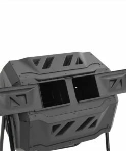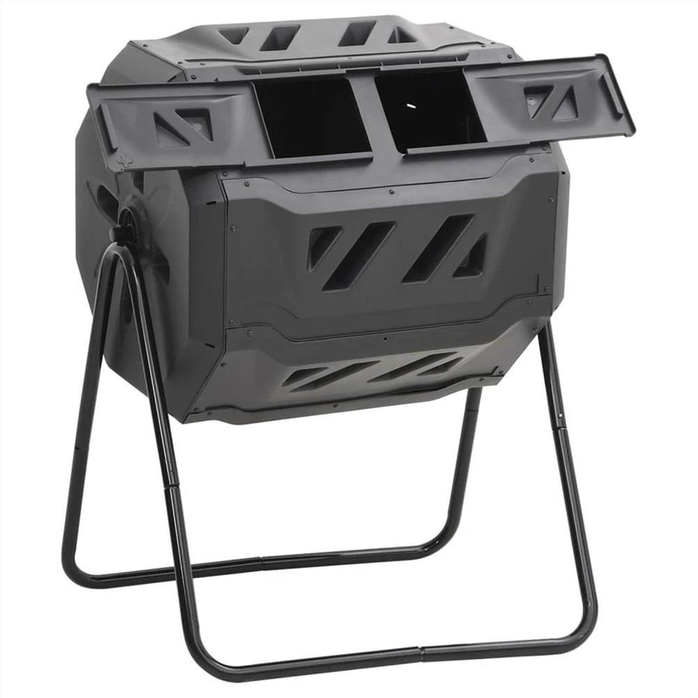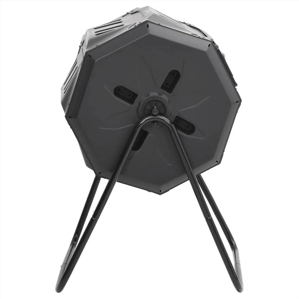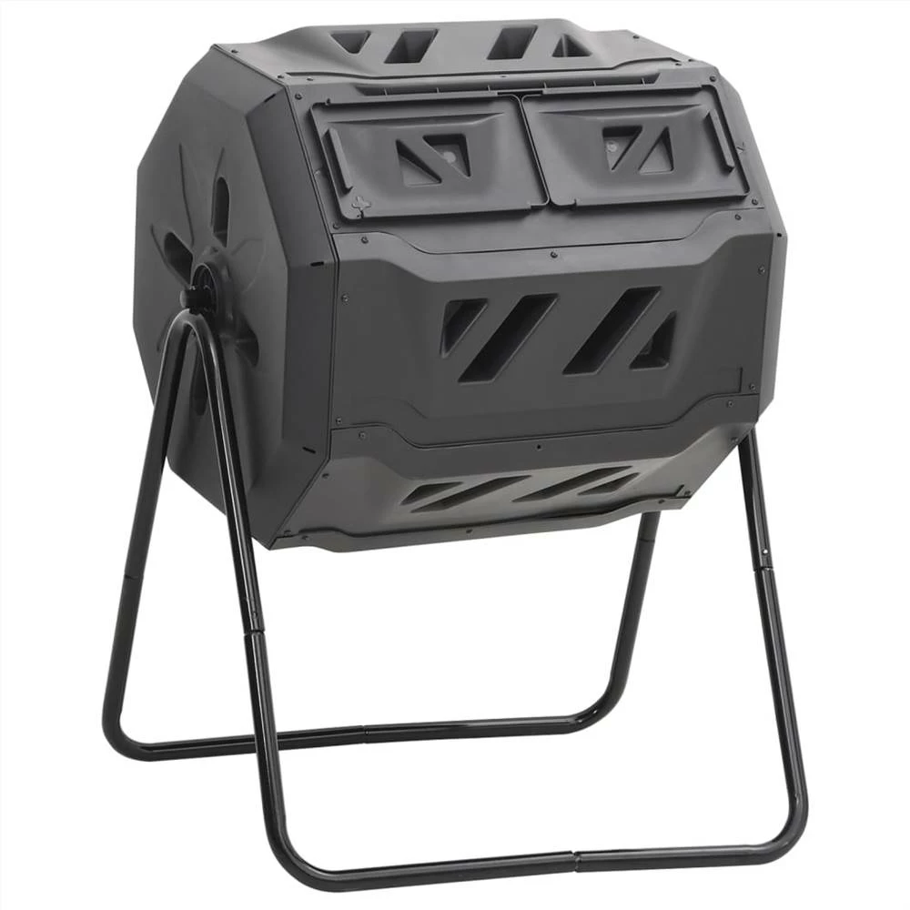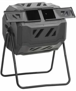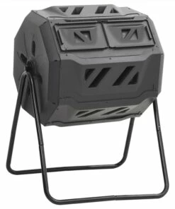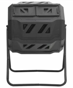 This garden compost bin helps to hasten the decomposition of organic matter and prepare fertiliser on your own. Effortless use: Simply fill the bin with garden and kitchen waste and spin it a few times every day. Thanks to the 360 degrees rotating design, you do not have to move the compost independently.Practicable design: The composter bin with two separate chambers is very convenient. While on one side the decomposition is already happening, new material can be refilled on the other side. Efficient ventilation: The ventilation holes and deep grooves make it easier to move the compost with air, as well as crushing lumps into place. The black barrel absorbs heat well, which contributes to the process.Excellent choice: With a bin, you can speed up decomposition. Composter can also have the advantage of making it harder for rats to get at your compost.