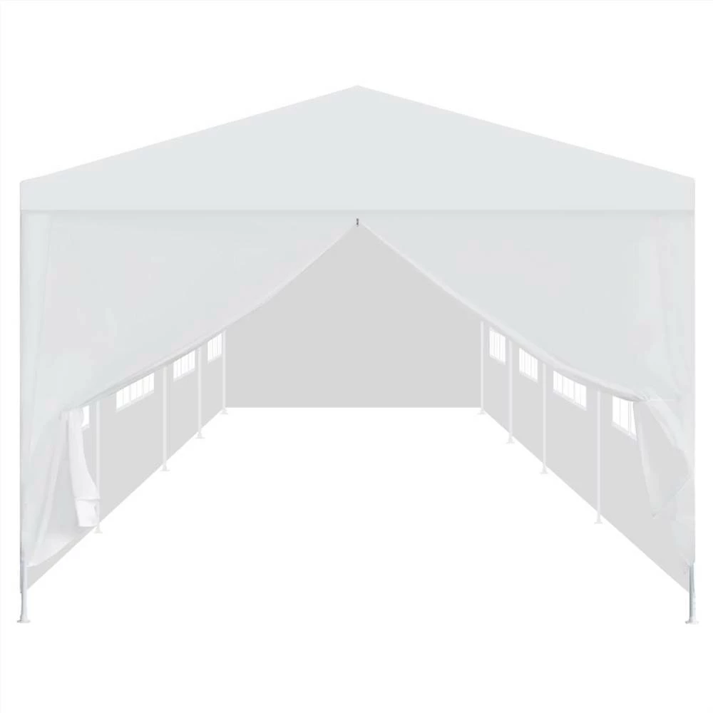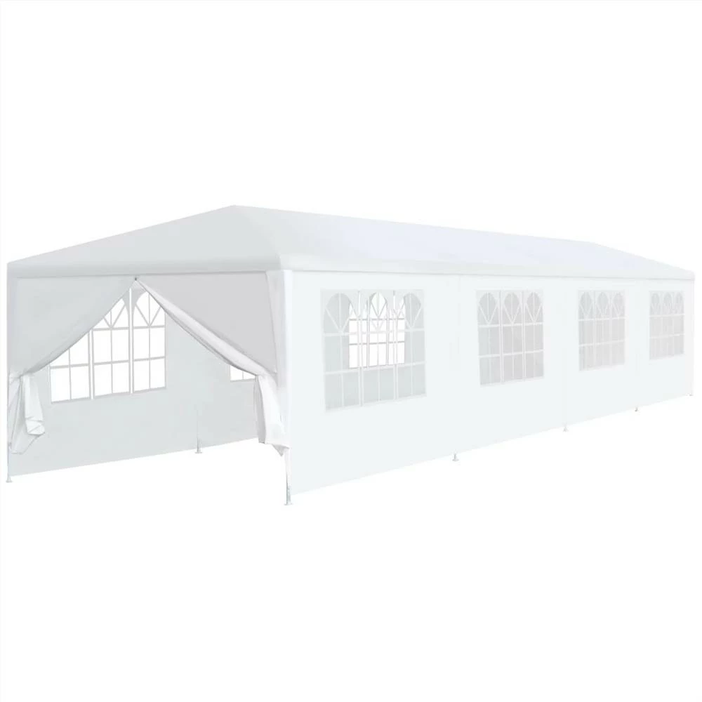 This garden marquee is a wonderful place to entertain your family and friends at all sorts of outdoor parties and get-togethers. You can also install it in your backyard as a large sunshade for your family and guests. Made of 100% polyethylene material, the party tent is UV resistant and water resistant. The marquee has 8 removable side panels, each with decorative windows, and 2 door panels with zips for easy entrance. This frame is manufactured from rust-resistant steel and thus highly durable. Assembly is easy. Please note that we recommend treating the canopy with a waterproof spray if the marquee is subjected to heavy rainfall. NOTE: This product should NEVER be used under bad weather, such as strong wind, heavy rain, snow, storm, etc.