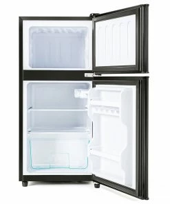 This double-door refrigerator has a compact and cool appearance to represent contemporary feeling and meet various needs. As a compact and freestanding design, this black double-door refrigerator could be a backup refrigerator to hold beverages and snacks in the living room, kitchen or beside the sofa. The interior has a capacity of 60 liters and is equipped with LED light bulbs for non-blinding lighting.