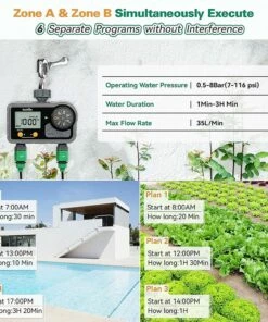 This large sprinkler timer system has 2 optional watering frequencies: Week Cycle Mode (from Monday to Sunday) and Day Cycle Mode (every 2/3/4/5/6 days). It is flexible for you to choose the suitable mode according to your local climatic conditions and specific watering needs.