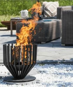 This black Irving fire basket from the RedFire range adds a unique atmosphere to your garden and terrace. The garden fireplace is practical and spacious, with a good size and beautiful design, making it suitable for any garden style. The wood logs stay in place with its steel pillars all around. Simply light the fire and gather around the flames to enjoy the warmth. With a diameter of 43 cm, several logs can easily fit in at the same time. The Irving is made of one piece, so no need for assembly. The featured surface texture gives it an industrial look, with the black heat-resistant powder coating, making the fire pit a real eye-catcher in any garden. To enjoy the fire pit for a long time, you can clean the frame the next day or after cooling down to prevent fast wear and tear.