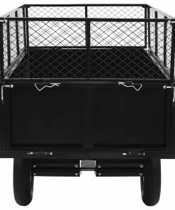 This tipping trailer for lawn tractor can be attached to all common lawn tractors. It is a robust trailer to transport soil, peat, manure, compost, leaves, fruits, building material, etc. This garden trailer has a load capacity of up to 300 kg. The height can be extended to + 30 cm. The side walls can be folded down and tilted back. Including universal coupling device to attach the trolley (by bolts).