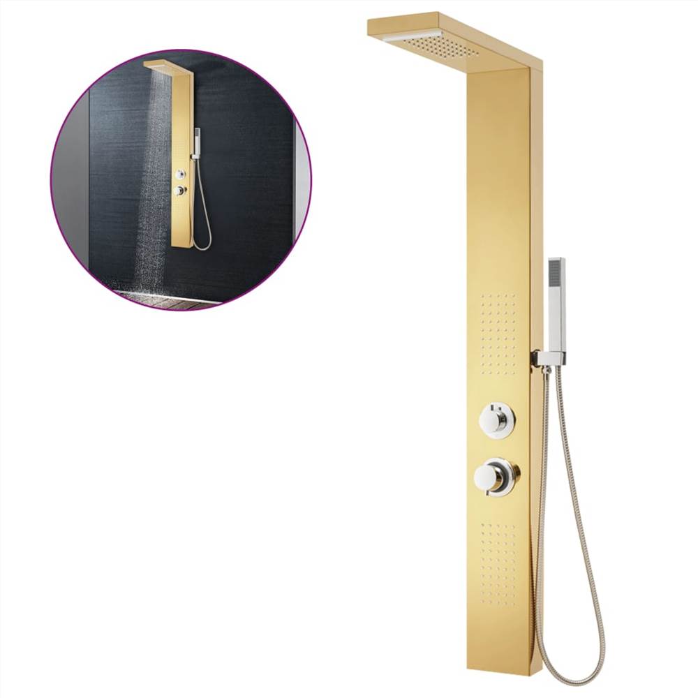 This multifunctional golden shower panel system features a stylish design and makes a great addition to your bathroom. The shower tower is made of durable stainless steel with a gold mirror finish, featuring a beautiful, square design. It has four functions: rainfall, waterfall, massage jets and a handheld showerhead, which can be easily selected using a knob. Immerse yourself in a truly relaxing shower experience and enjoy the modern style of this beautifully designed shower panel system!